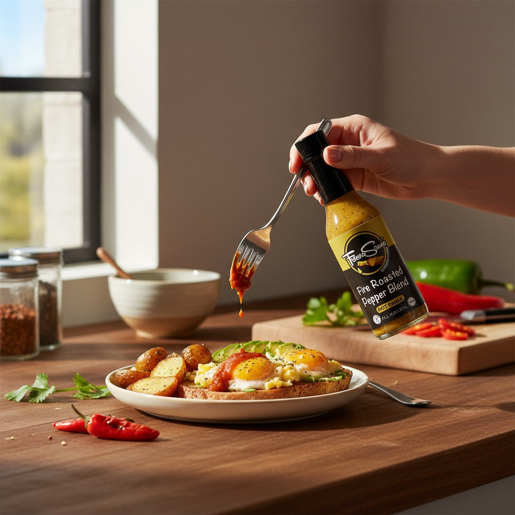 Experience bold, smoky perfection with our Fire Roasted Pepper Blend Hot Sauce, crafted with fire-roasted jalapeños and serrano peppers for a deep, charred flavor that’s impossible to resist. Balanced with a splash of fresh lemon juice and aromatic spices, this vinegar-free recipe delivers a smooth, citrusy heat that enhances every bite.
