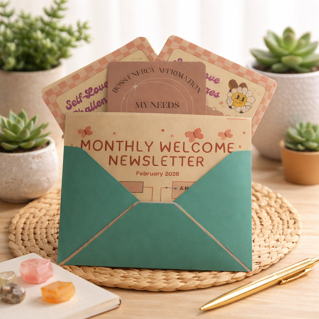 Each envelope is thoughtfully curated around a monthly theme focused on inspiration, reflection, and personal growth. Perfect for first-time customers, gifting, or anyone who wants to experience happy mail without committing to a subscription.