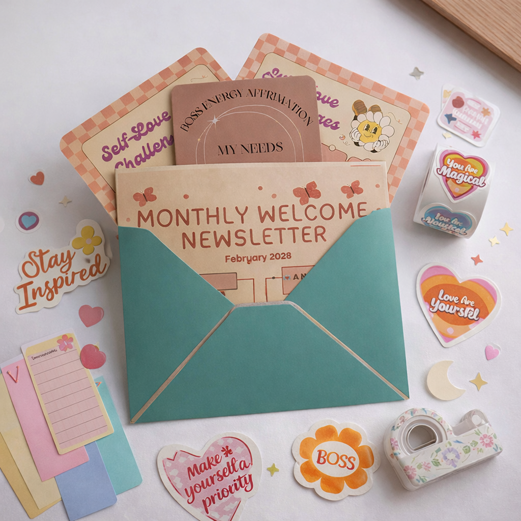 The Inspirational Snail Mail Subscription – Premier is our most elevated monthly happy mail experience, created for those who want inspiration with extra intention, care, and thoughtful details. Each envelope is curated around a meaningful monthly theme focused on self-care, encouragement, and personal growth.