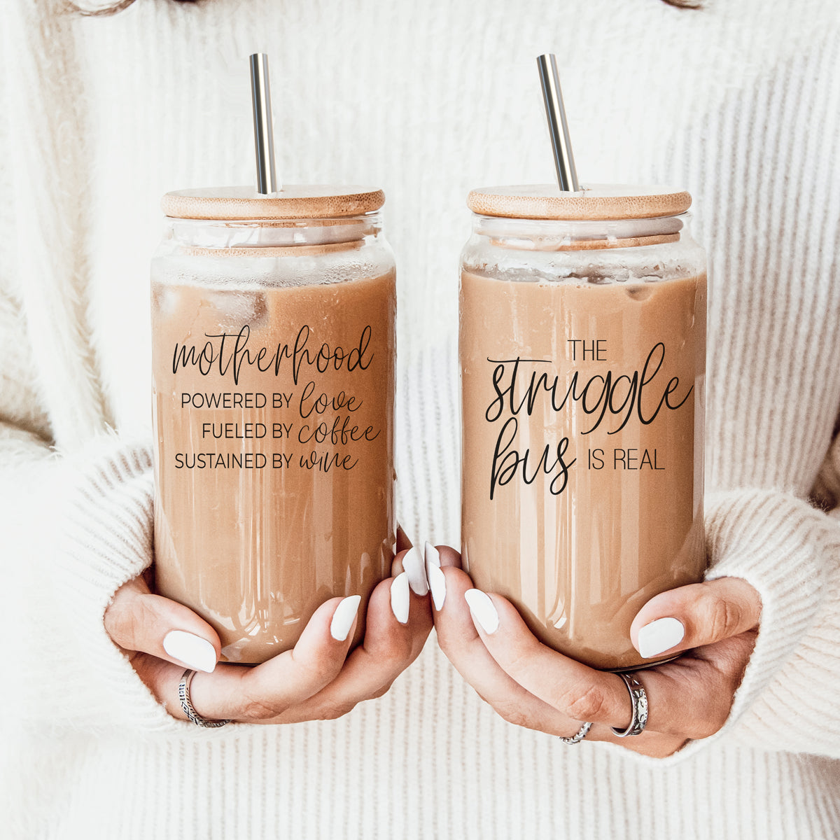 Our glasses with bamboo tops. Drink it with the top and straw of choice, remove the bamboo lid and drink straight from the glass.